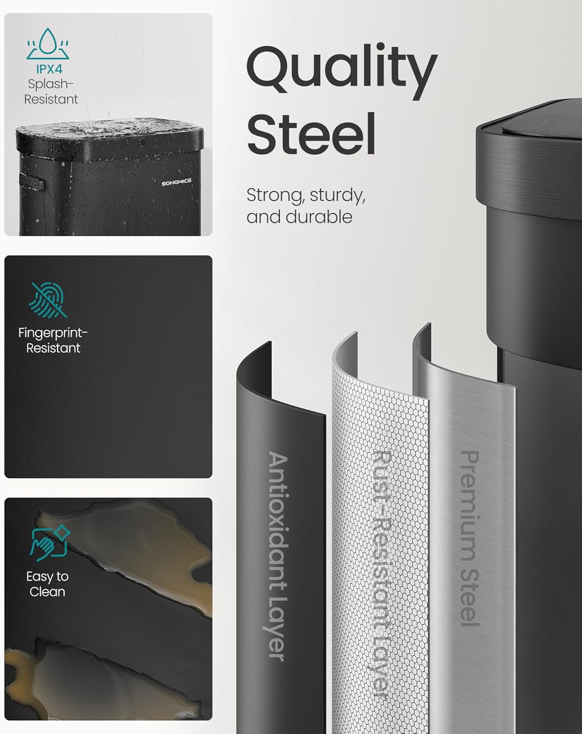 - Built to Last: Crafted with a stainless steel body, this automatic garbage can is rust-resistant and easy to clean. Its IPX4 splash-resistant design ensures enduring use