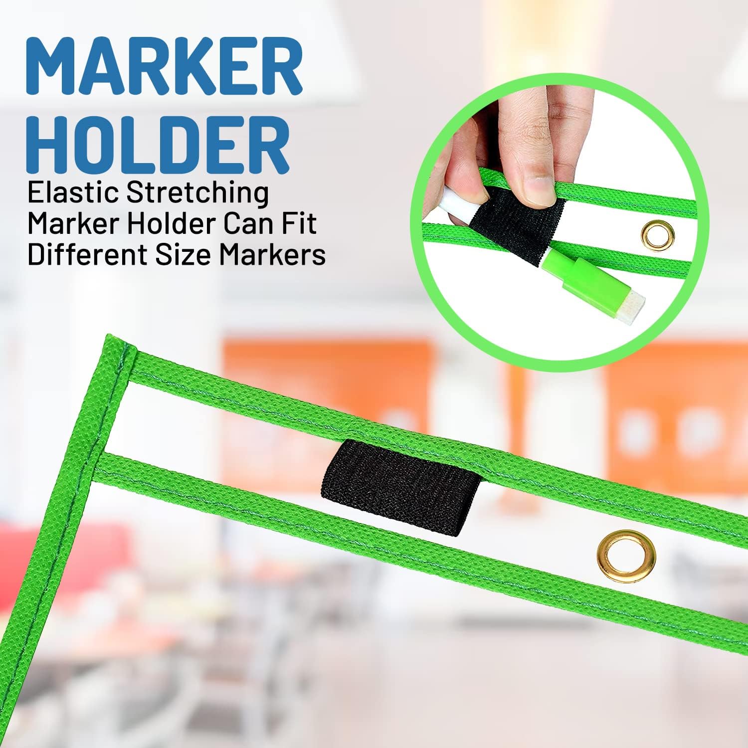 - Smart Features for Stress-Free Use Includes metal eyelet for hanging, elastic pen holder & 10 bright colors for organization. Dry erase sheets are easy to find, easy to use — no more lost markers.