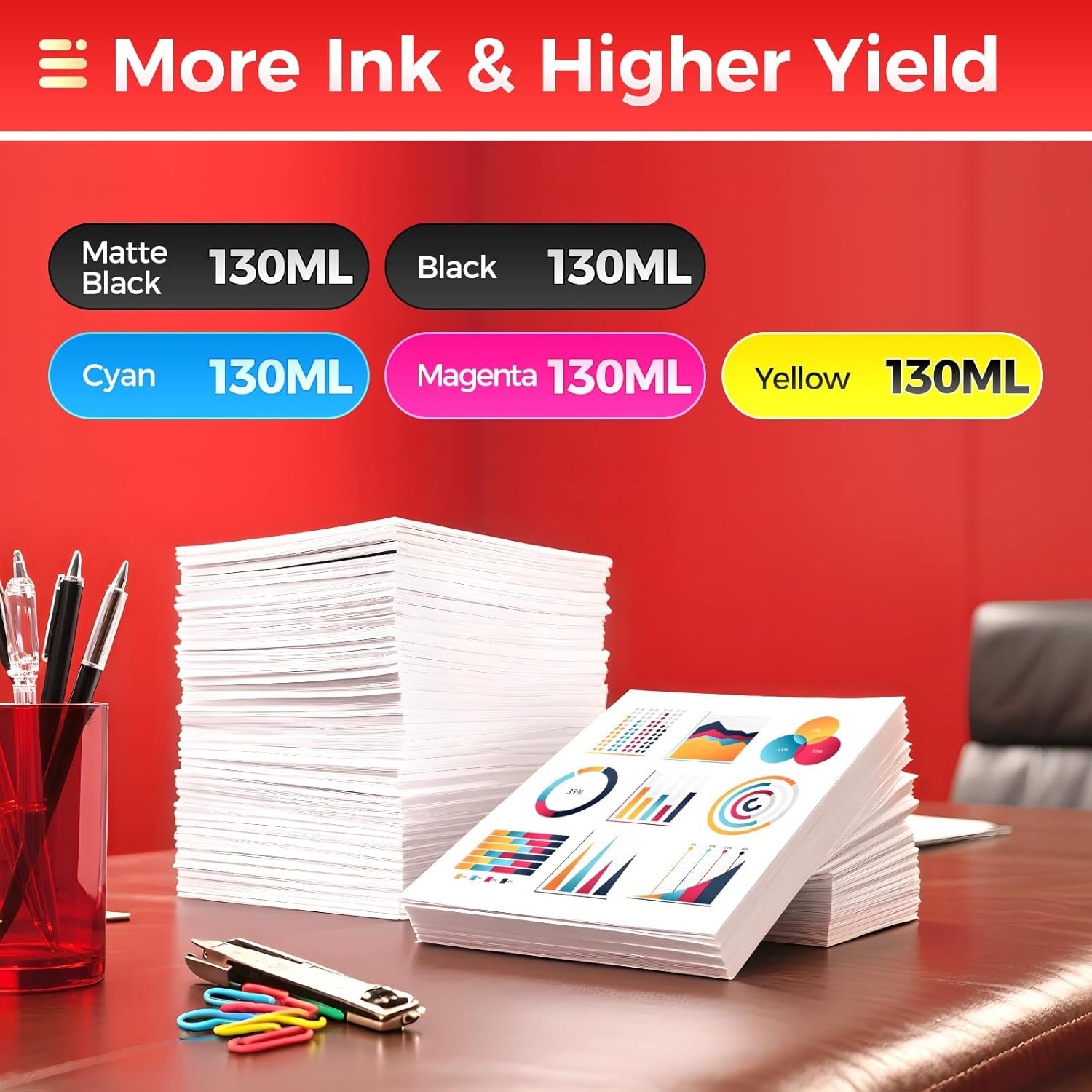 - Ink Volume: The capacity is 130ML per ink cartridges, Total ink volume is 650ml.