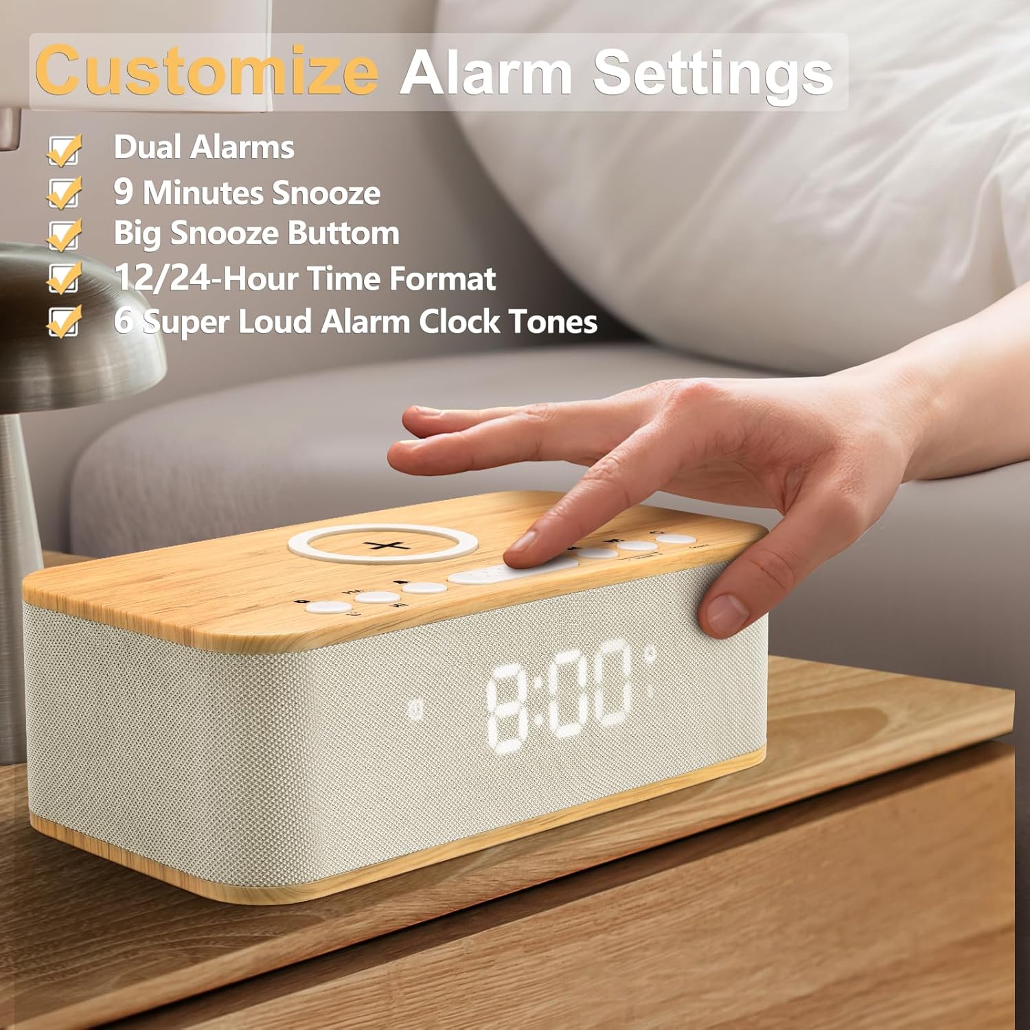 - 【Dual Alarms & Snooze for Busy Schedules】Designed with your routine in mind, this alarm clock for bedrooms allows you to set two independent alarms, ideal for couples or varied daily plans. The alarm clock also features six unique alarm sounds and a 9-minute snooze option, helping you ease into your day. Stay punctual and rested with this all-in-one alarm clock