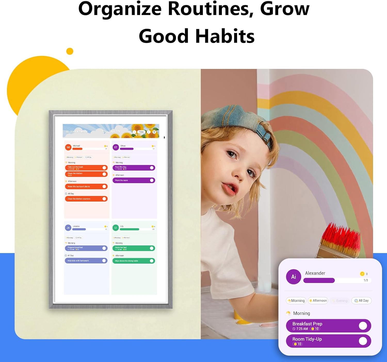 - Interactive Chore Chart & Routine Planning: Manage your household with an electronic calendar that keeps your home organized with an interactive chore chart and routine planner; assign tasks with reminders; track progress with color-coded labels; help kids build daily habits through consistent routines and chores.