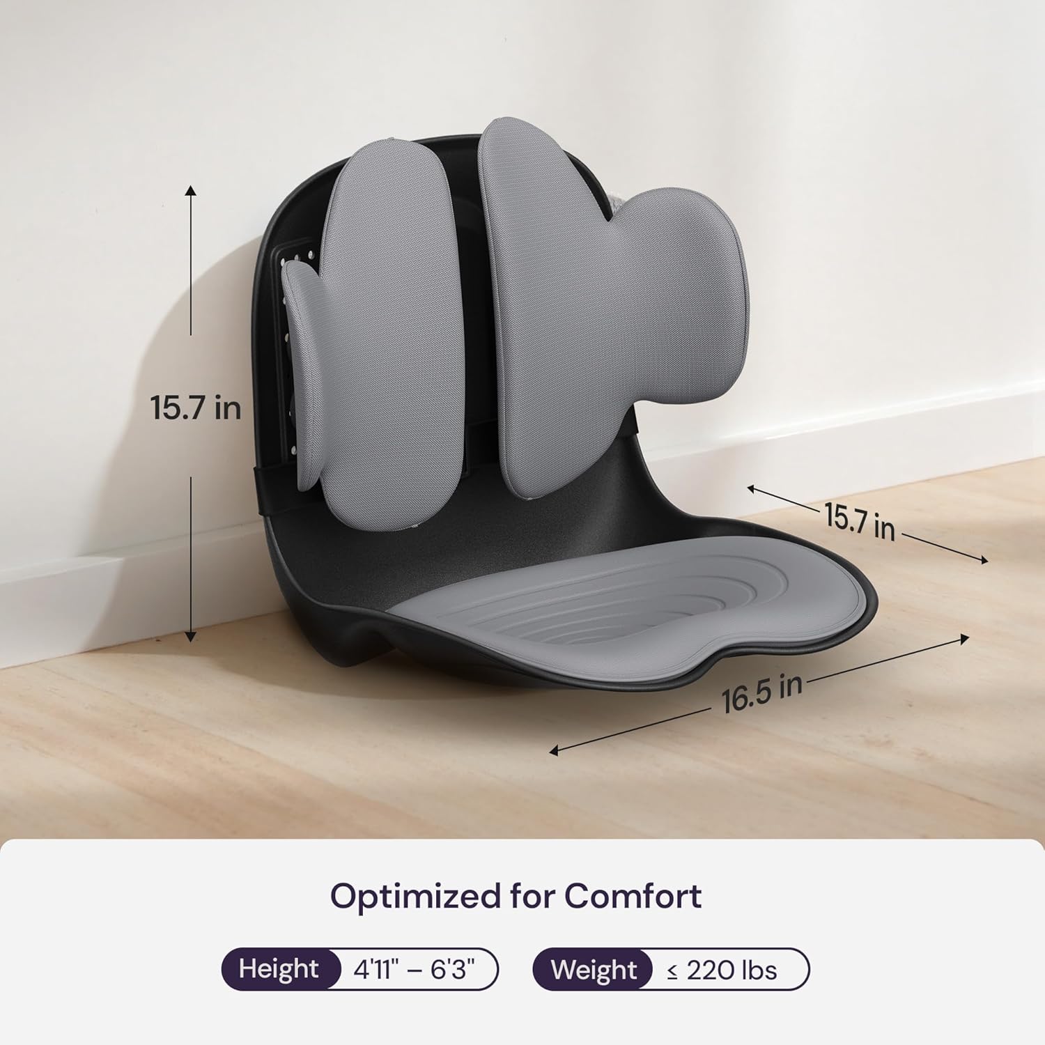 - PATENTED 3D SPINE SUPPORT – Two piece back support frame wraps your lumbar and thoracic spine, tips your pelvis into a neutral position, and encourages an effortless, upright posture the instant you sit down. Slide the back support onto any chair or seat you've got an instant upgrade.