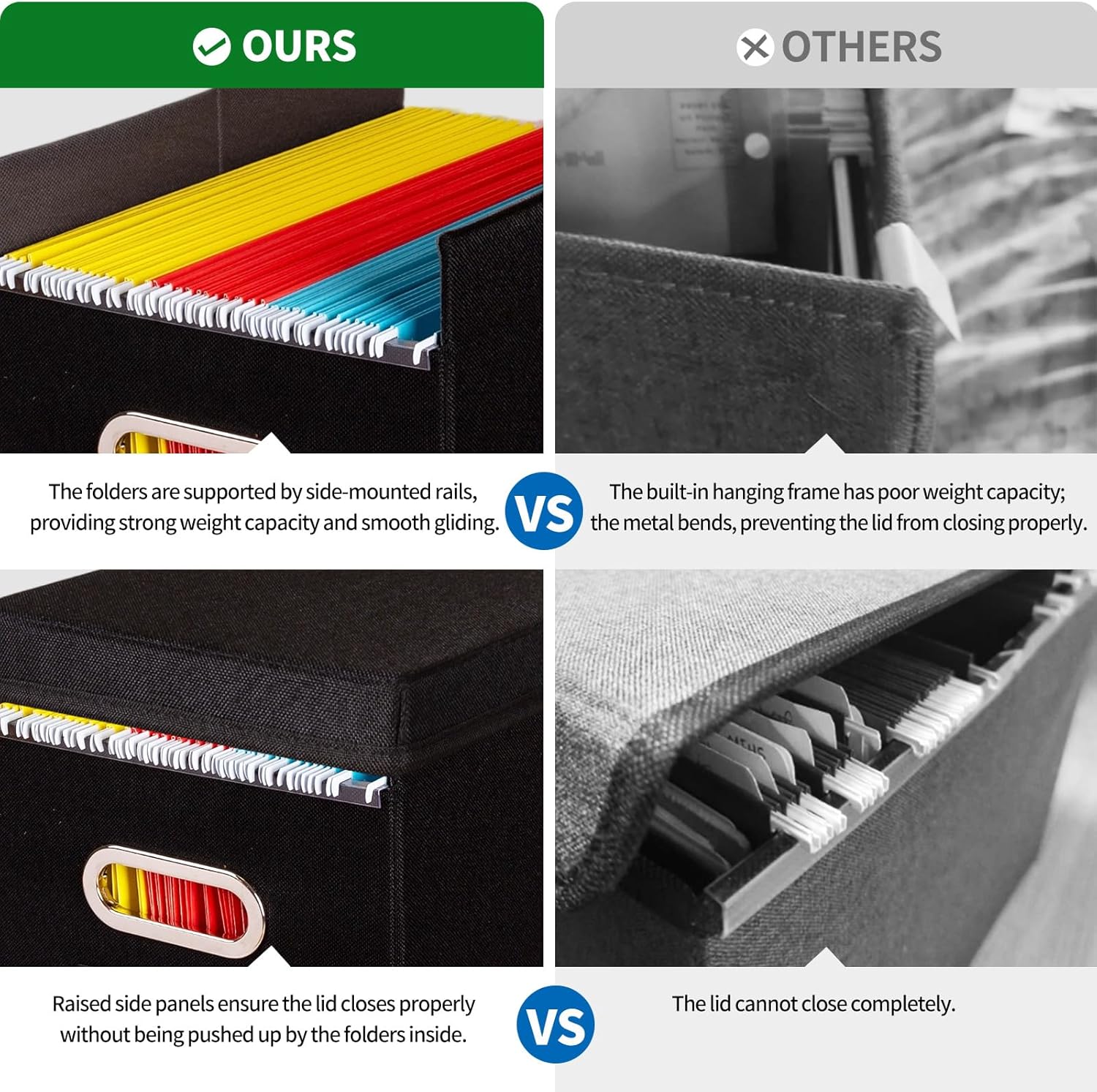 - Exclusive Lid-Friendly Design: Unlike standard file boxes, our unique raised-side design prevents file tabs from bending when the lid is closed. Features smooth PVC rails on front and back for effortless sliding, perfect for hanging file folders without damaging tabs