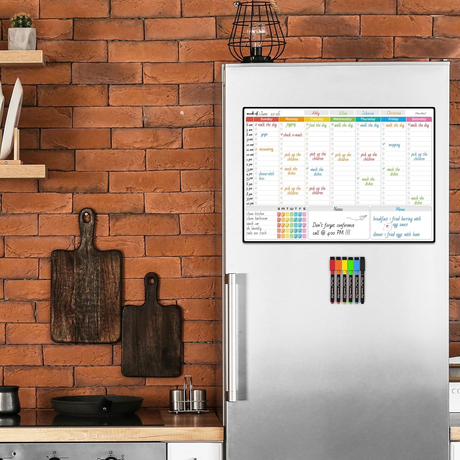 - Fine-point markers included – We also provide 6 extra-fine point markers with different colors, so you may use your own color coding. These magnetic markers stay conveniently attached to your fridge.