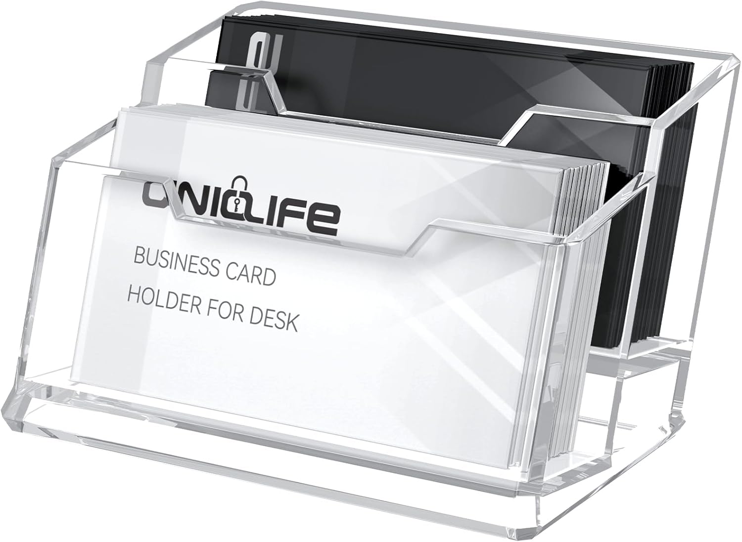Uniclife Acrylic Business Card Holder for Desk 2 Slots Clear Business Card Display Stand for Men & Women Desktop Business Card Organizer Card Stand for Office Home Exhibition, 120 Card Capacity