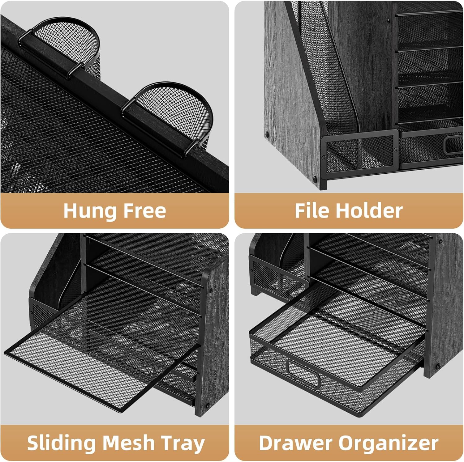 - 【Space Saving】All office document folders would be organized by the vertical file holder. The paper tray organizer is very suitable for storing books, magazines, letters, and A4 paper. The drawer organizer and hanging pen holder enough accommodate all office supply accessories, such as pens, pencils, scissors, and so on. Perfect Size: 13.8*11*12inch.