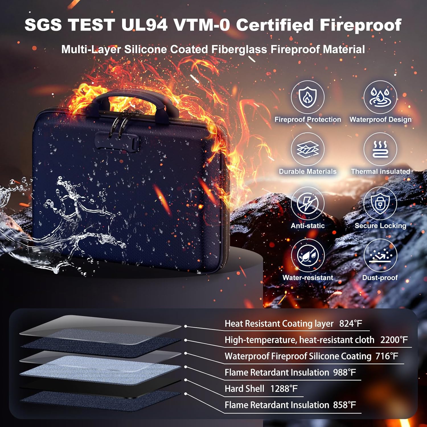 - UL-94 VTM-0 Certified Fireproof Box: HIBWN Fireproof document box is made of high quality flame retardant fiberglass, passed UL-94 VTM-0 professional fire resistance combustion test, with superb fire resistance. Surface used waterproof silicone coating, ensuring that your documents and valuables are protected in case of fire, flood or wet weather.