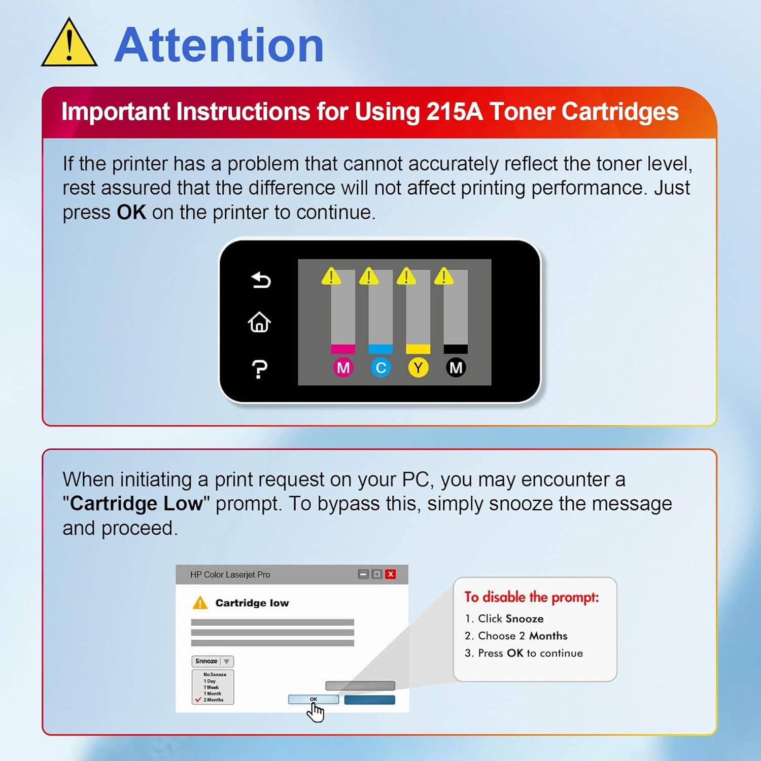 - HIGH PAGE YIELD: Up to 1050 pages for 215A toner cartridge black and 850 pages for per 215A color toner cartridge(Letter/A4, at 5% Coverage)