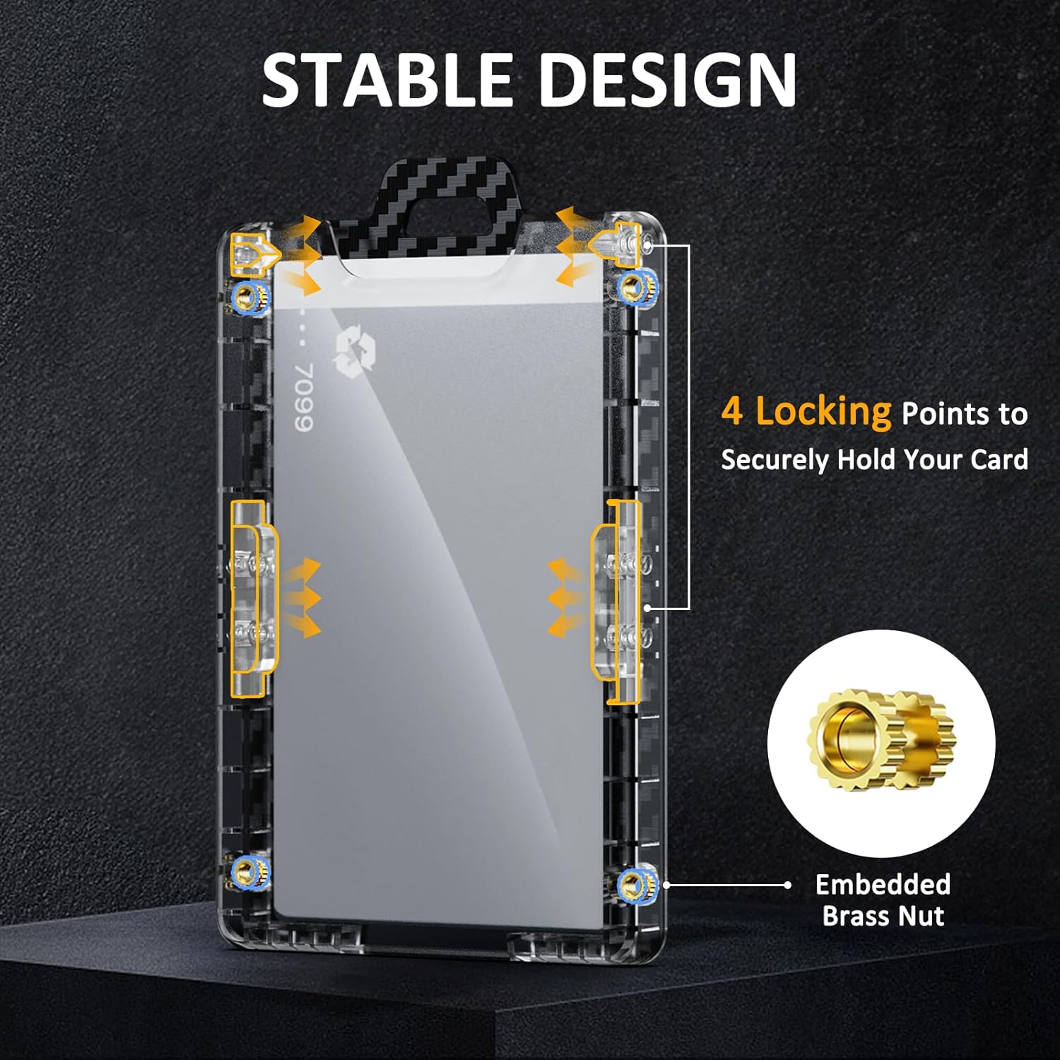 - 𝐔𝐩𝐠𝐫𝐚𝐝𝐞𝐝 𝐁𝐚𝐝𝐠𝐞 𝐇𝐨𝐥𝐝𝐞𝐫--The outer shell is made of ultra-light 3k carbon fiber and PC material, which is lightweight and durable, weighing only 0.91oz. Four elastic points on both sides of the interior ensure your cards are securely fastened. Recessed brass nuts at the four corners securely fasten the carbon fiber plate and polycarbonate shell, eliminating the worry of screws falling out and the badge holder falling apart.