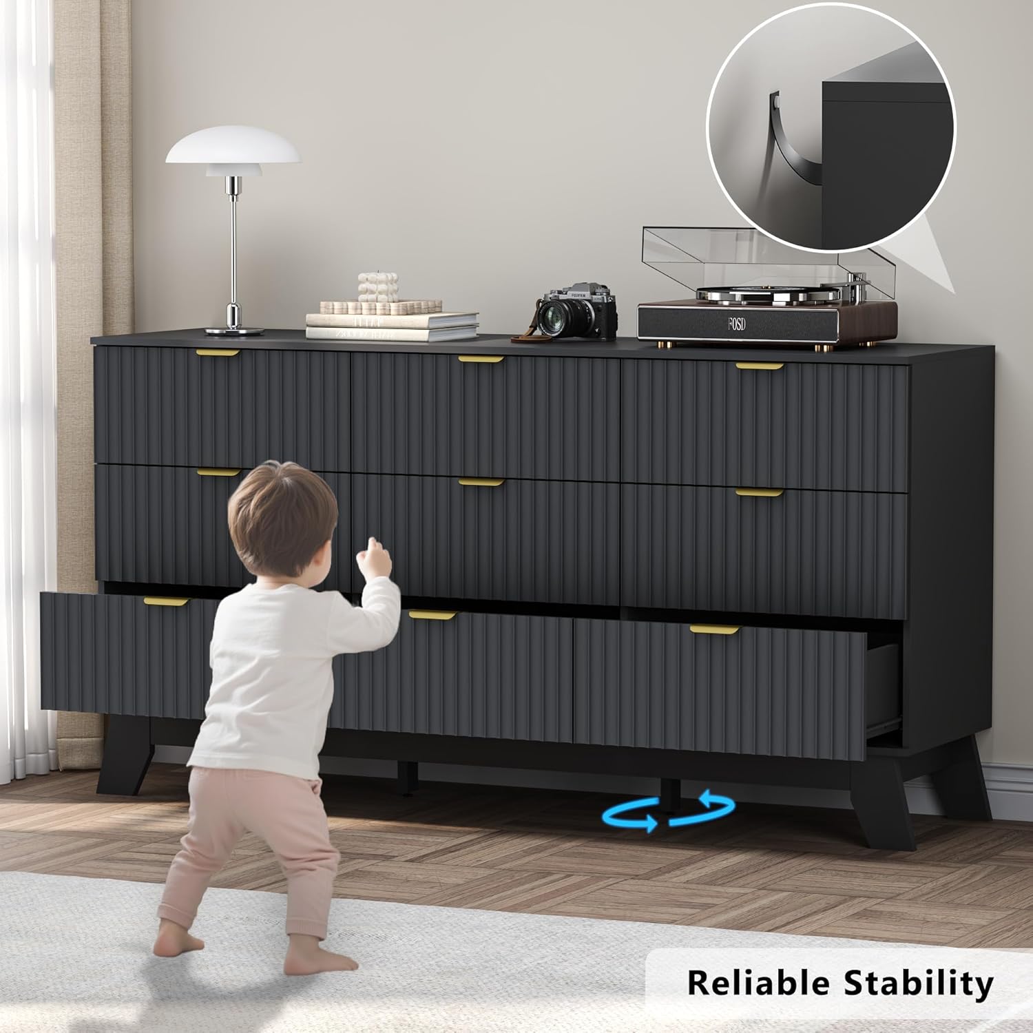 Fluted 9 Drawer Dresser, 57.1" Wide Modern Boho Chest of Drawers, Wooden Storage Dresser TV Stand for Bedroom, Living Room, Closet, Hallway, Curved Profile Design