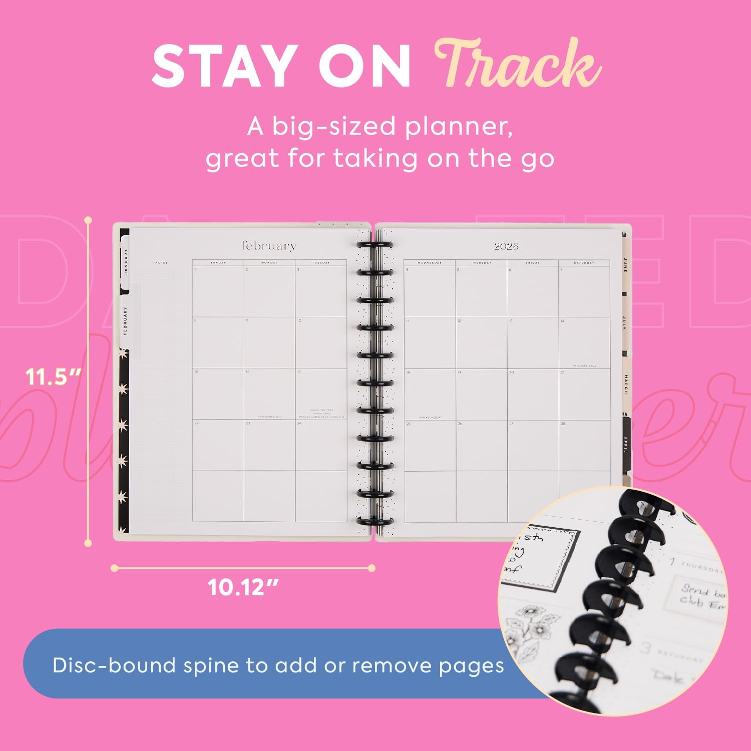 - DESIGN: This 12-month tabbed weekly planner includes 12 months of calendars and weekly spreads, 3 extra months, 2 sticker sheets, and premium-weight paper. The sturdy frosted covers protect the pages, and the plastic discs allow you to customize with accessories.