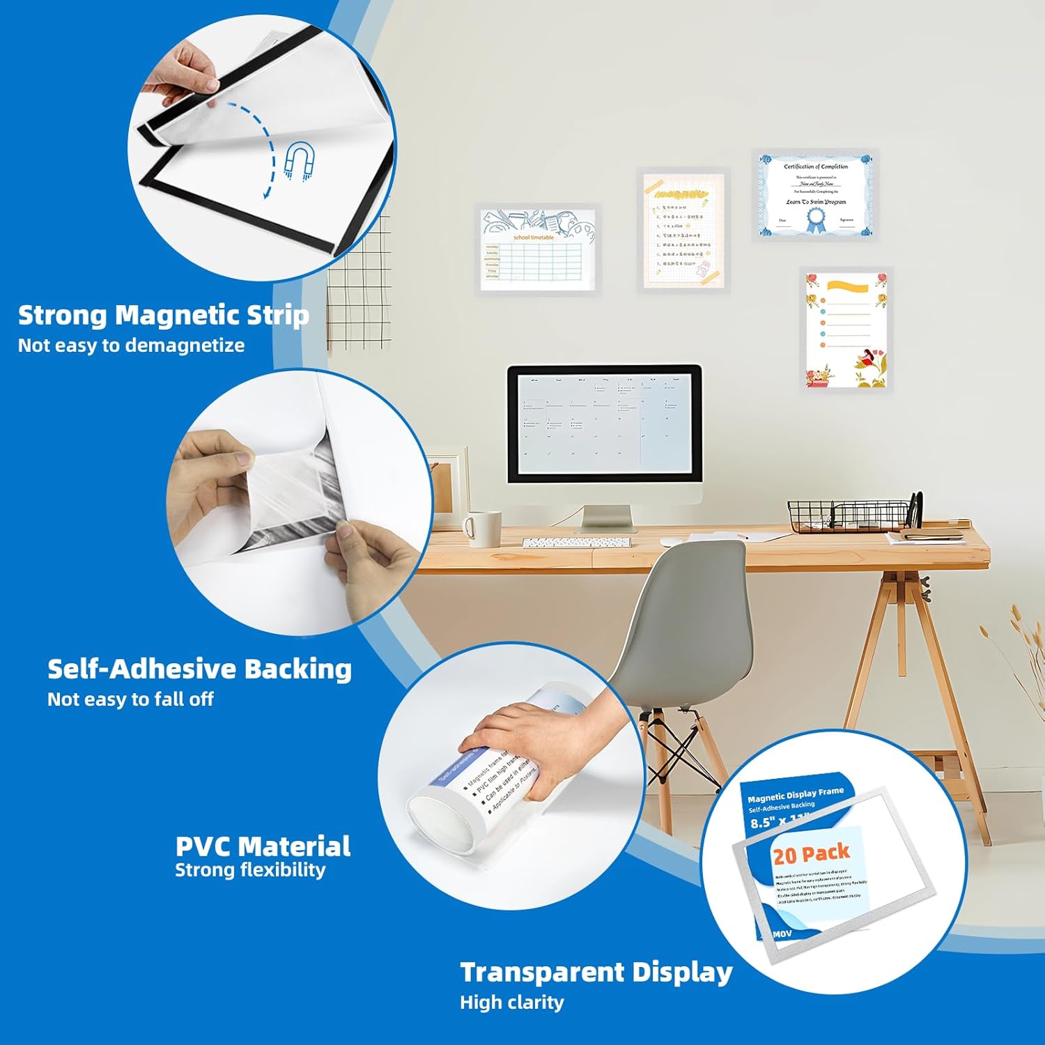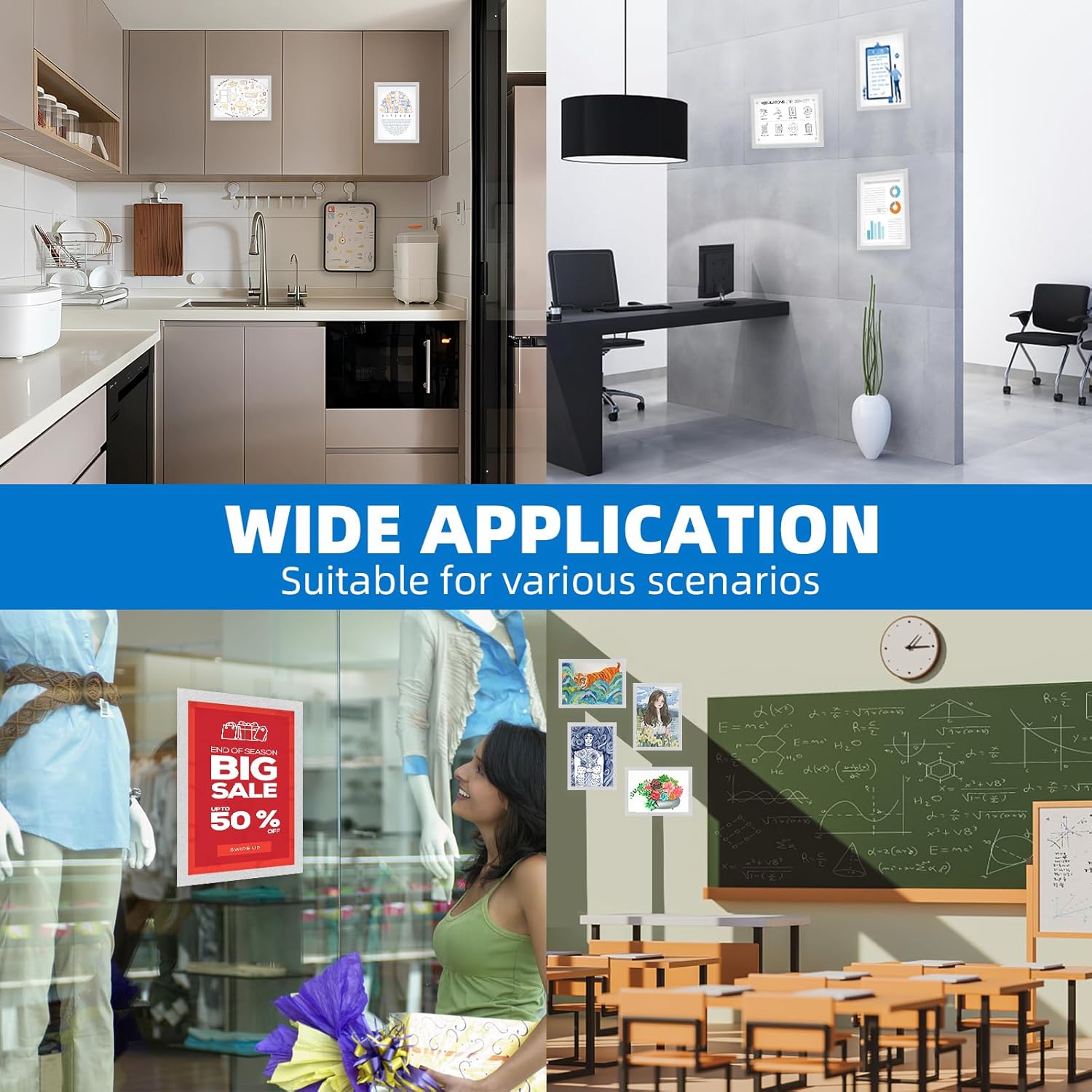 - Multi-Purpose Magnetic Page Holder: The magnetic display frame 8.5 x 11 is widely used in store, home, office, school, restaurant, factory, hotel for displaying poster, certificate, price list, photo, memo, etc. Includes 20 pack reusable adhesive frames