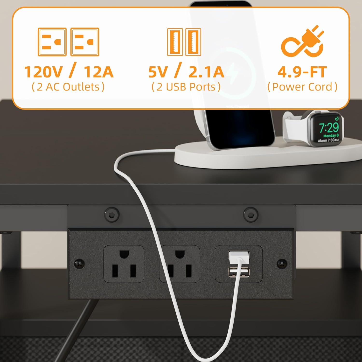 - 【Recessed Power Outlet & 2 USB Ports】Product dimension: 22.8"L×15"W×24.1"H. Large printer table built in 2 power outlets and 2 USB charging ports. Easily to plug in printer/laptop/phone/lamp and charge on the top at the same time.
