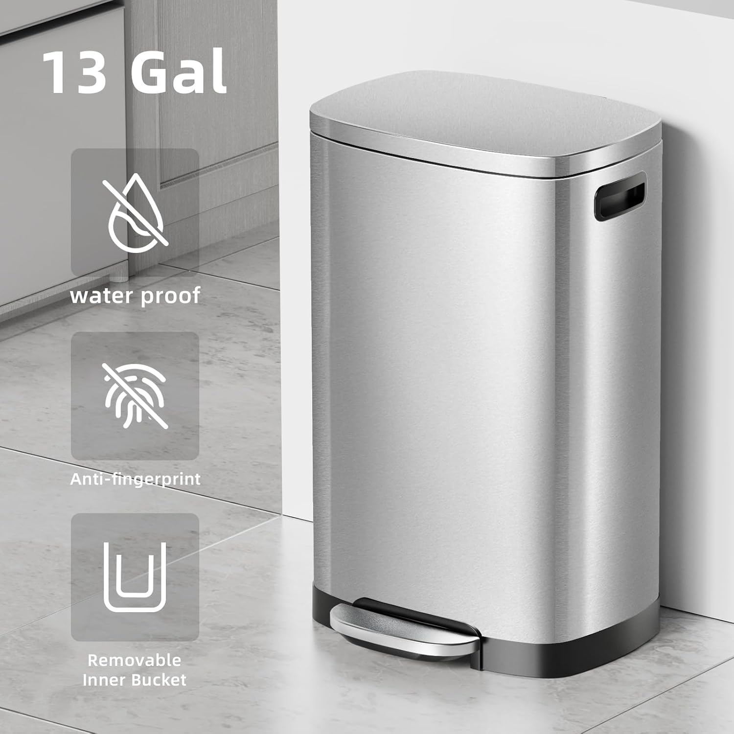 KUK 13 Gallon/50L Stainless Steel Kitchen Trash Can with Lid and Step Pedal-Large Capacity Garbage Bin with Odor Seal, Silent Close Lid, Removable Inner Bucket for Home, Kitchen, Bedroom, Silver