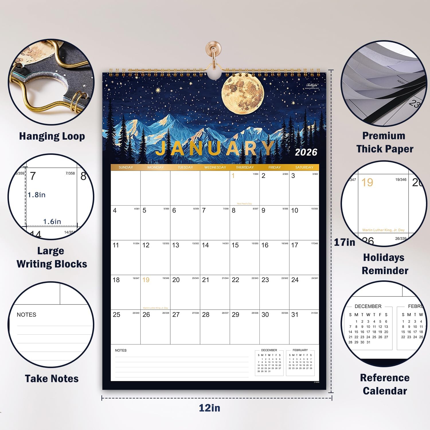 - 🌲 FUNCTIONAL DETAILS - Sturdy golden twin-wire binding for turning pages easily + Unruled daily blocks + Hanging Hole + Premium thick paper for comfortable writing and stored for a long time + Hard cover on the back this large wall calendar 2026 to protect your 2026 large calendar well.