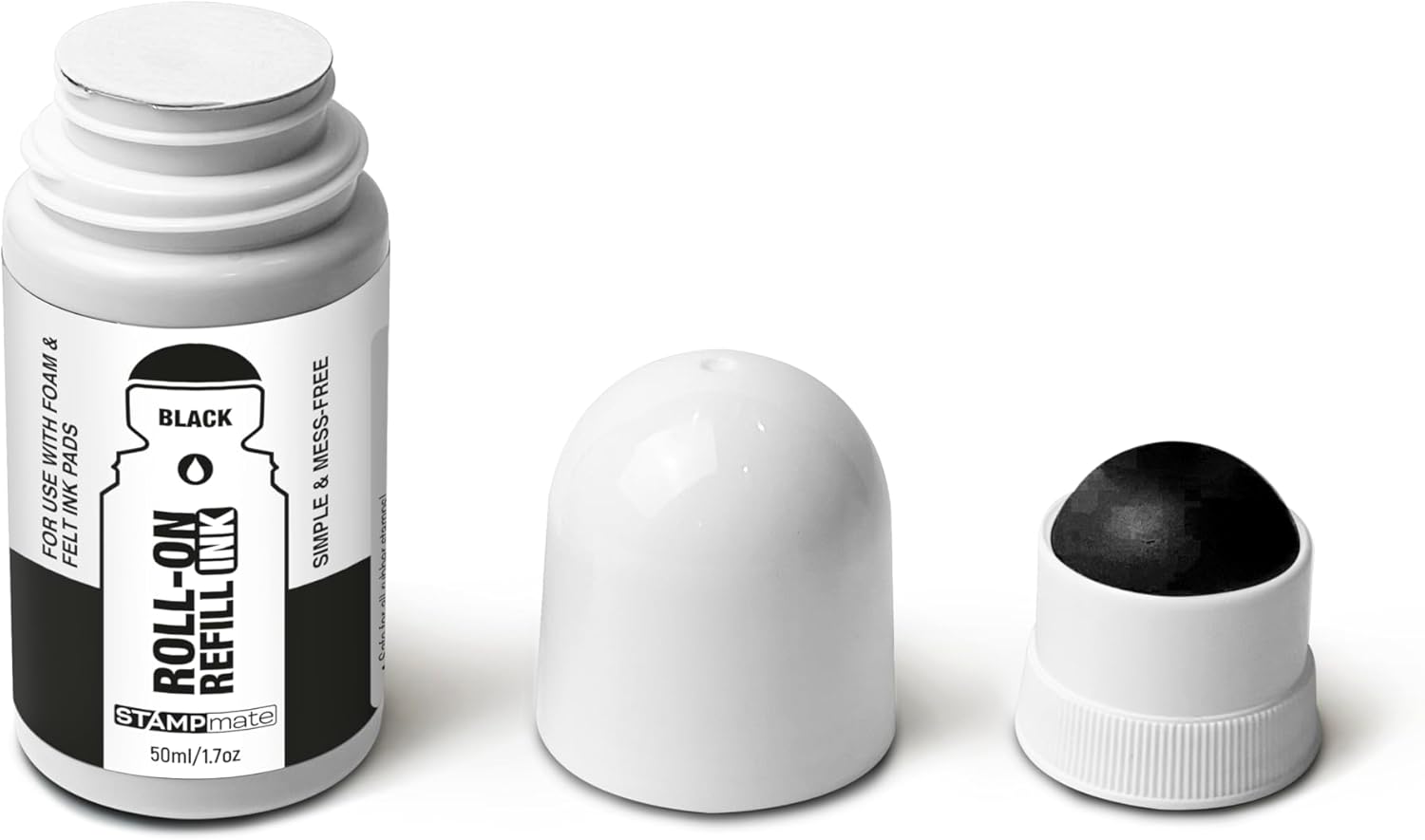 Roll-On Stamp Pad Ink Refill 50ml/1.7oz – Self Inking, Foam & Felt Pads – Easy-Use Roller Ball Applicator (Black)