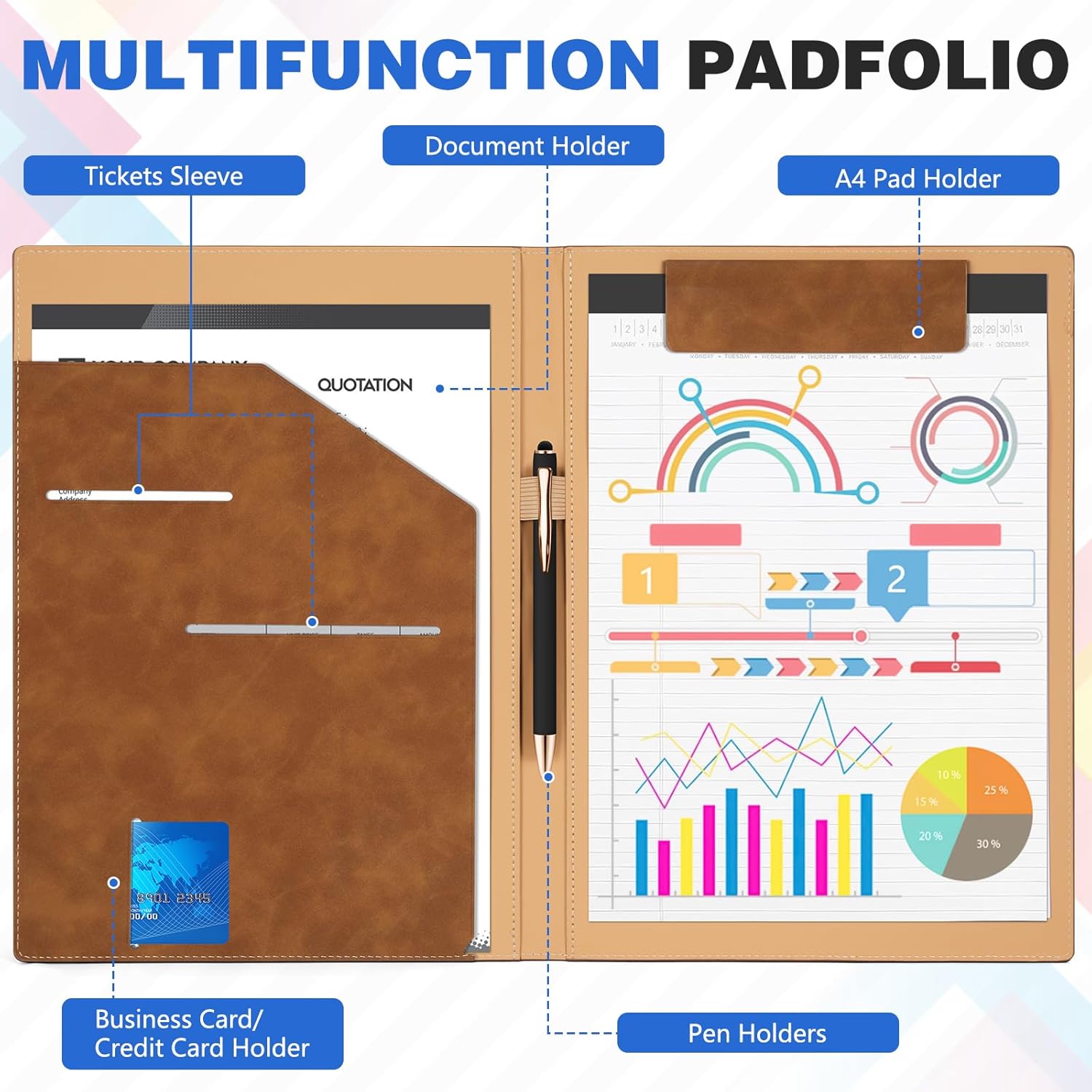 - 【Practical Organized Design】Built with usability at its core, the custom Portfolio Clipboard Folder includes 1 notepad clipboard, 2 receipt pockets, 1 pen holder, 1 A4 file & document sleeve, and 1 business card pocket. It streamlines organization, suiting both everyday use and business trips perfectly.