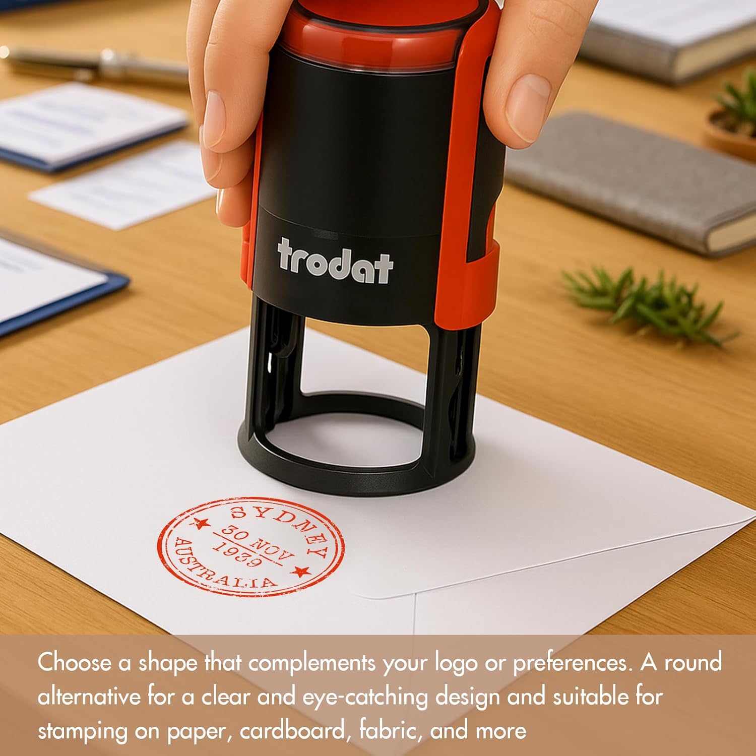 - Custom stamps self-inking: Click “Customize Now”, upload your design, enter the text, choose the size and color you want for the custom rubber stamp, and create tamper-proof personalized stamps in seconds!