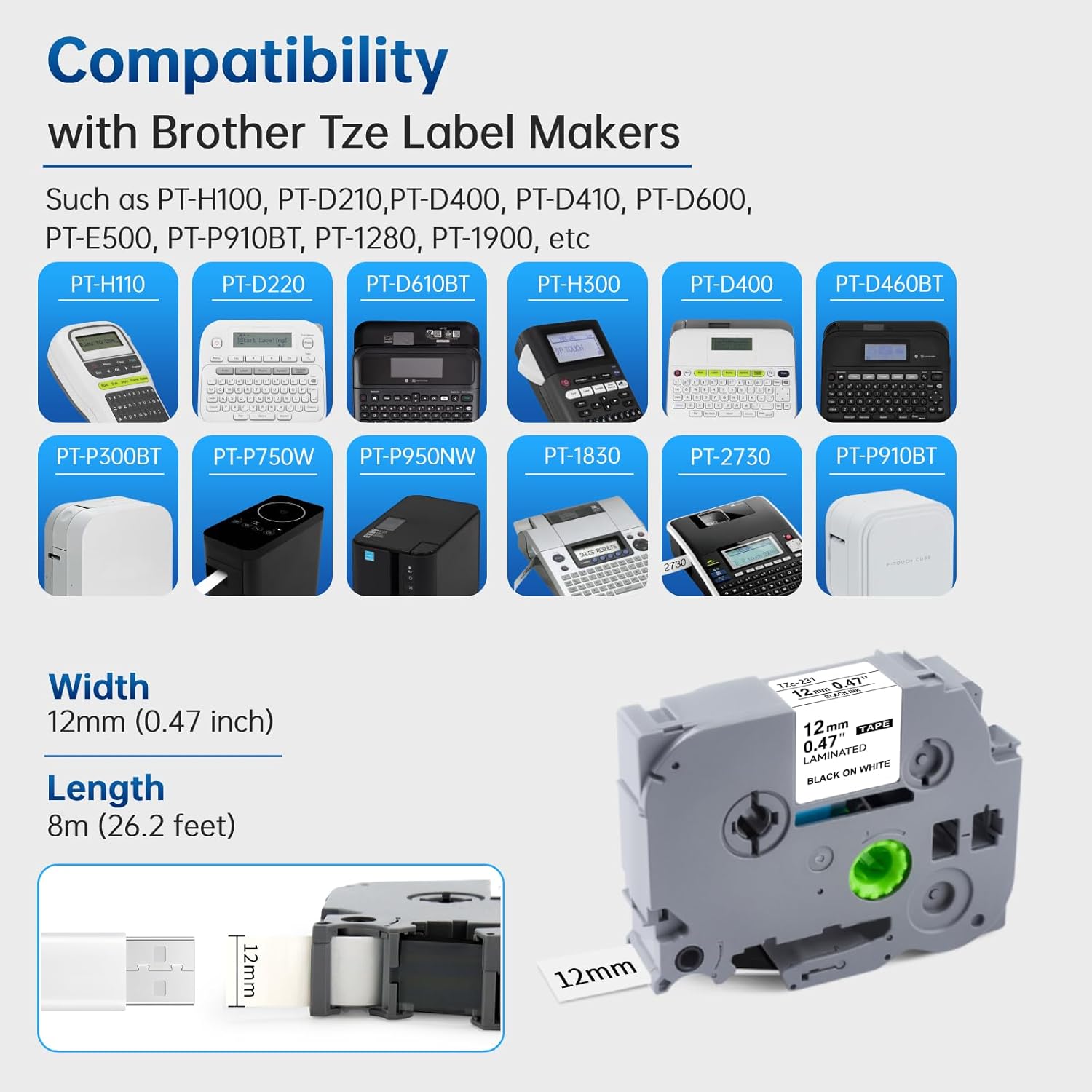 - Compatibility: Fullly compatible with brother p touch label makers that use tze label tape: PT-H100, PT-H110, PT-H111, PT-H103W, PT-D200, PT-D210, PT-D220, PT-D400, PTD400AD, PTD450, PTD600, PT-P700, PT-H500LI, PT-1180, PT-1230PC, PT-1280, PT-1290, PT-1700, PT-1880, PT-1890C, PT-1890W, PT-2040, PT-2300, PT-2430PC, PT2730, PT9700PC, etc. (No compatibility with mk / tc / btag series ! )