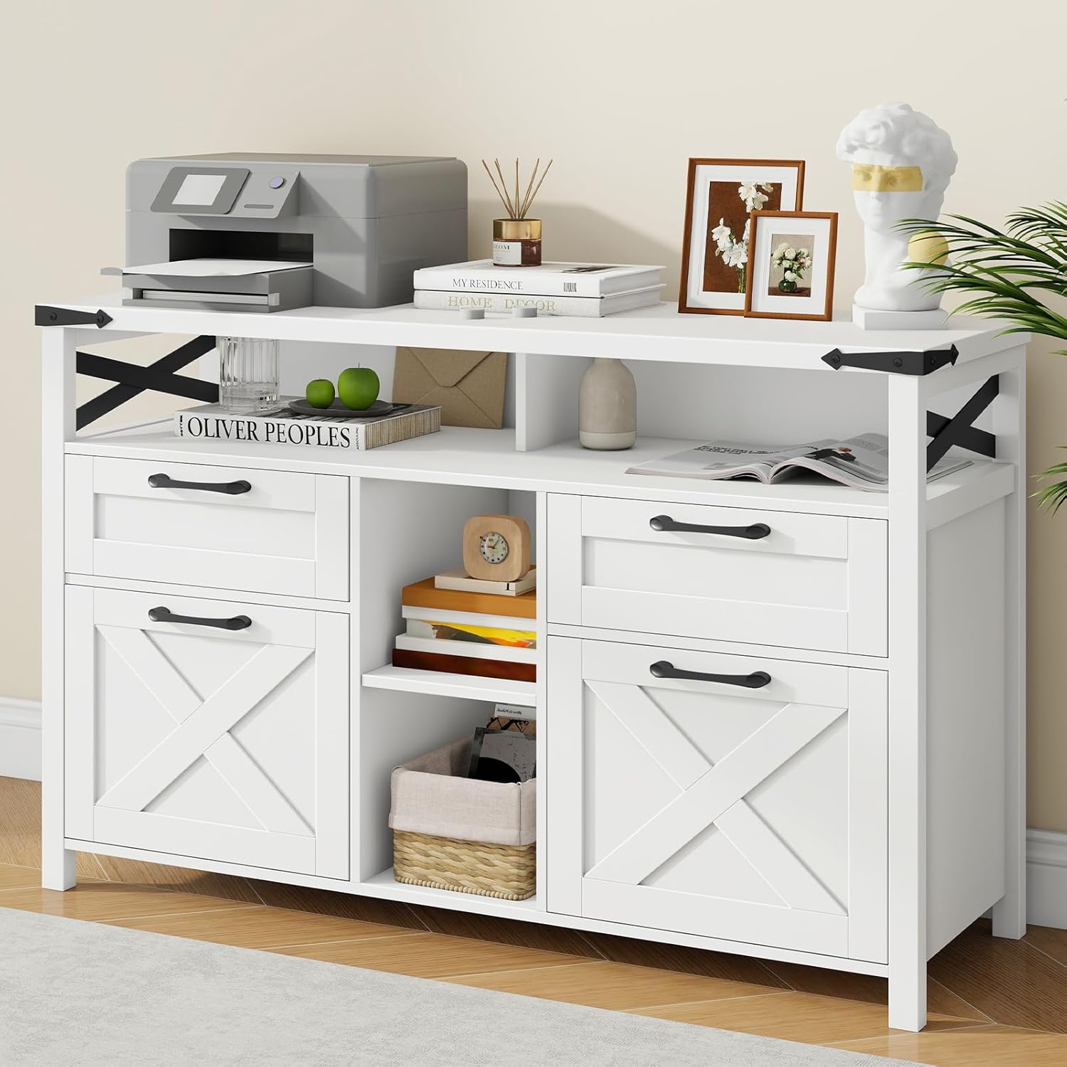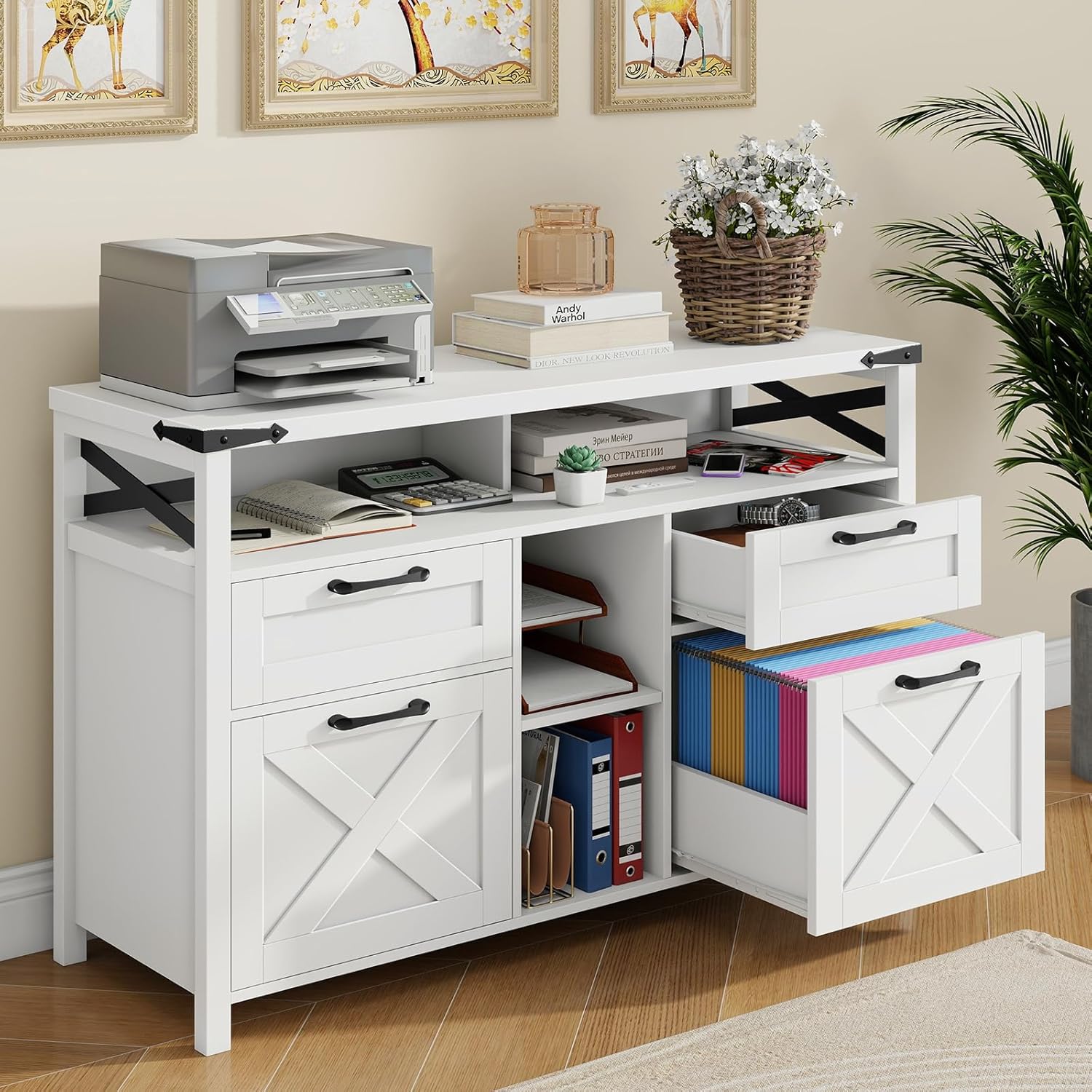 - 🗃️2. [Stylish Farmhouse Design]: This office cabinet captures a distinctively charming farmhouse aesthetic, offering a comfortable and understated presence. The X trim doors, accented with black metal handles, create a stylish mix of industrial and modern design elements, making this filing cabinet suitable for both residential and professional environments. It's crafted to help you craft a cohesive and visually pleasing workspace.